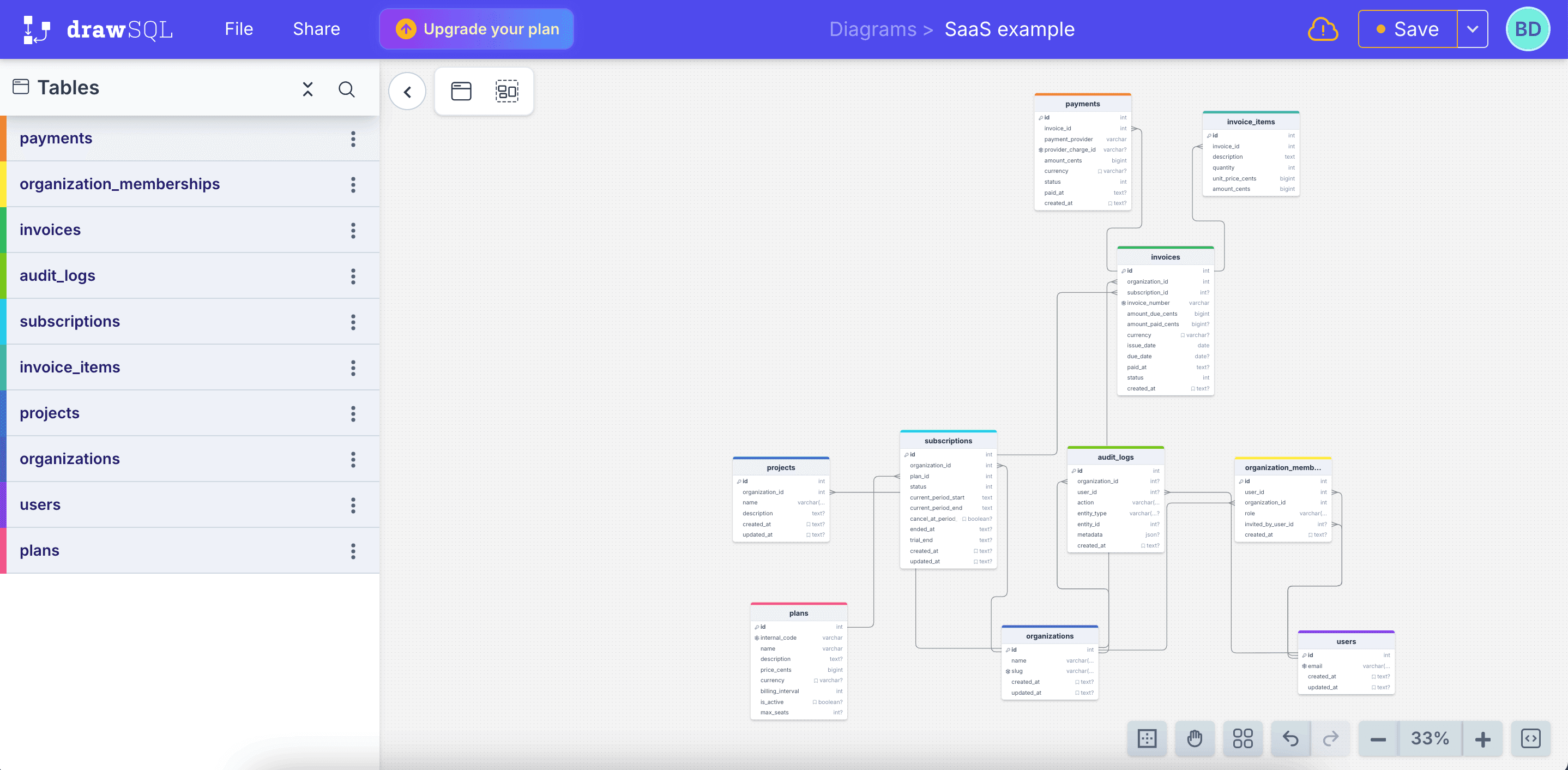For this comparison, I recreated the same SaaS schema visually in DrawSQL. It looked good. The canvas feels modern and friendly.