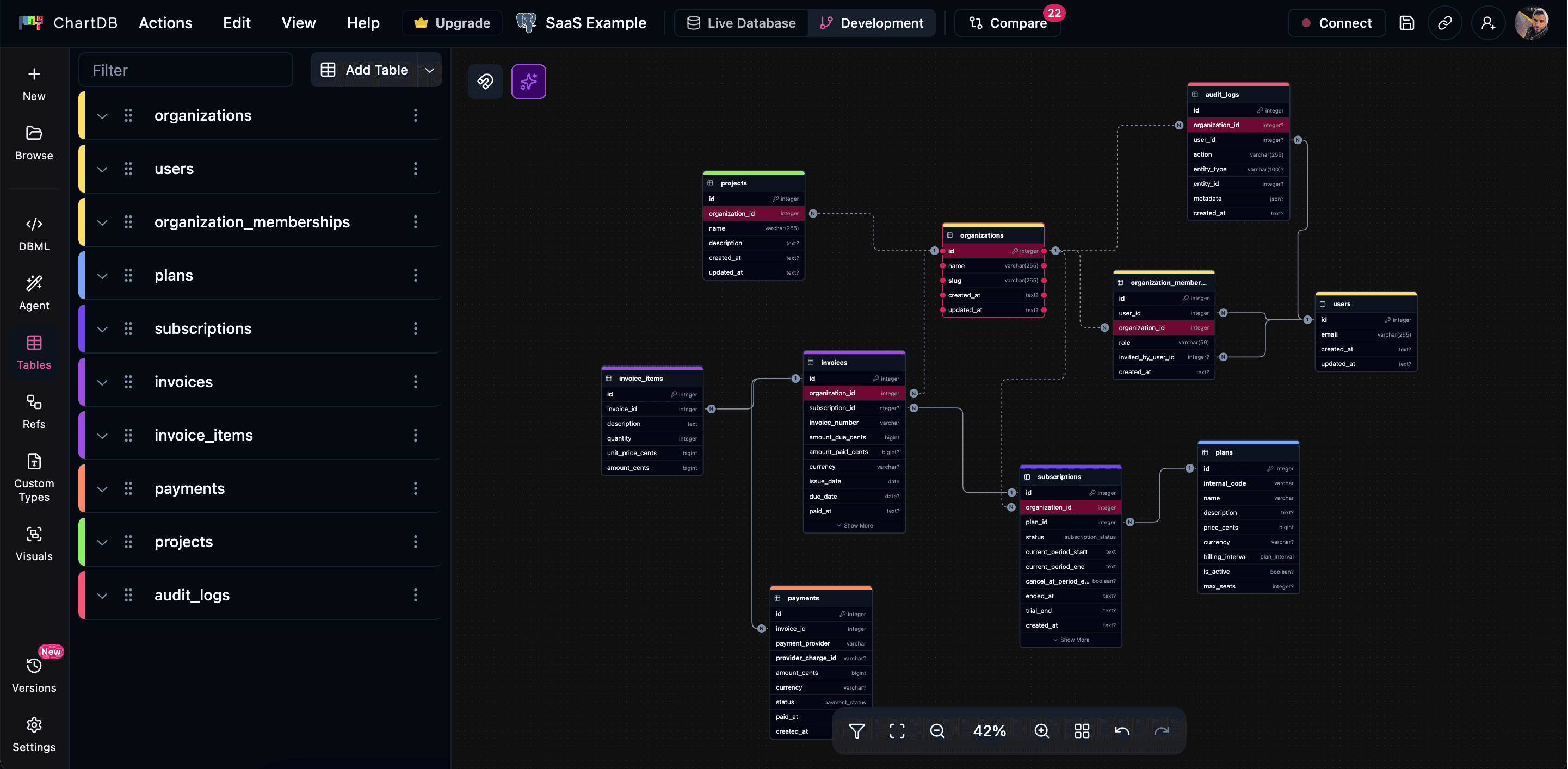 For this comparison, I took the same SaaS idea, gave the AI Agent a short prompt, and got an initial schema. From there I moved some tables, added colors for domains, and tightened the relationships. It felt like pairing with a smart assistant, not starting from a blank canvas.