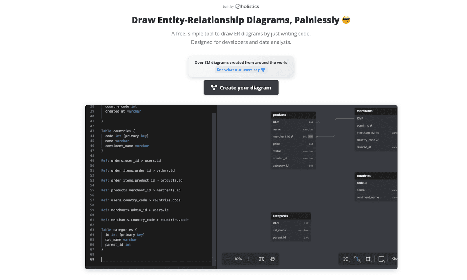 dbdiagram is the classic code first cloud ERD tool. You describe your schema in DBML or SQL, and it renders the diagram. It’s loved by developers who want modeling to feel close to code.