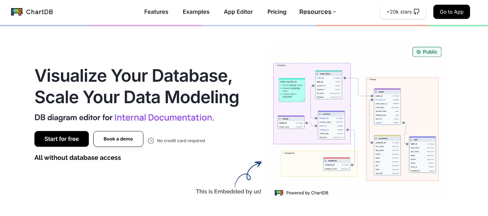 ChartDB is a modern database visualization and ERD tool built for engineers and data teams. You can import a schema quickly, explore relationships, organize the diagram visually, and use an AI agent to speed up repetitive modeling work.