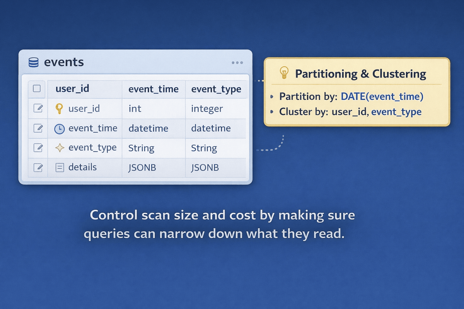 BigQuery’s pricing model makes schema design feel very real. When a query scans more bytes, it costs more. That means your goal is not only to make queries correct. Your goal is to make them selective.