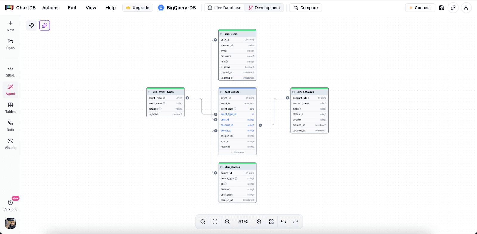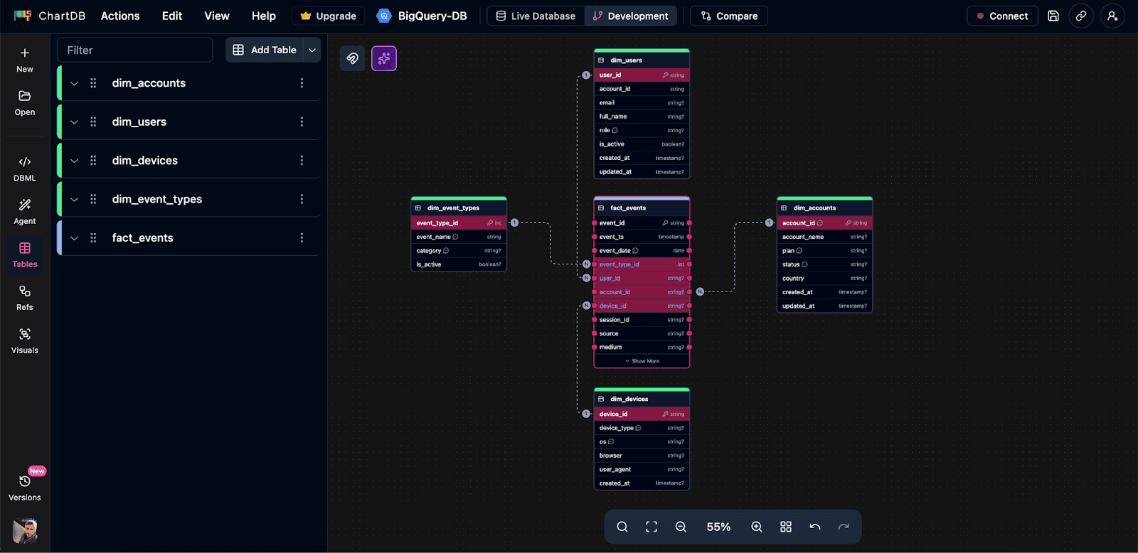 ChartDB helps teams design and validate BigQuery schemas visually before writing SQL, so you can catch issues early and keep the model understandable as it evolves.