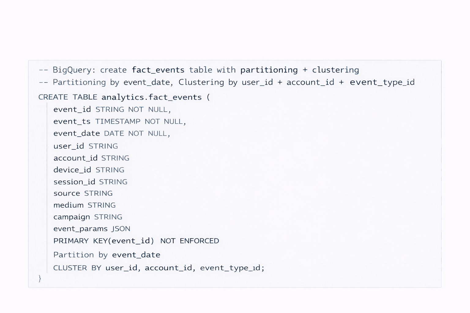 Define fields and data types with intent. If a field is used for partitioning, mark it. If a field is commonly filtered, note it.