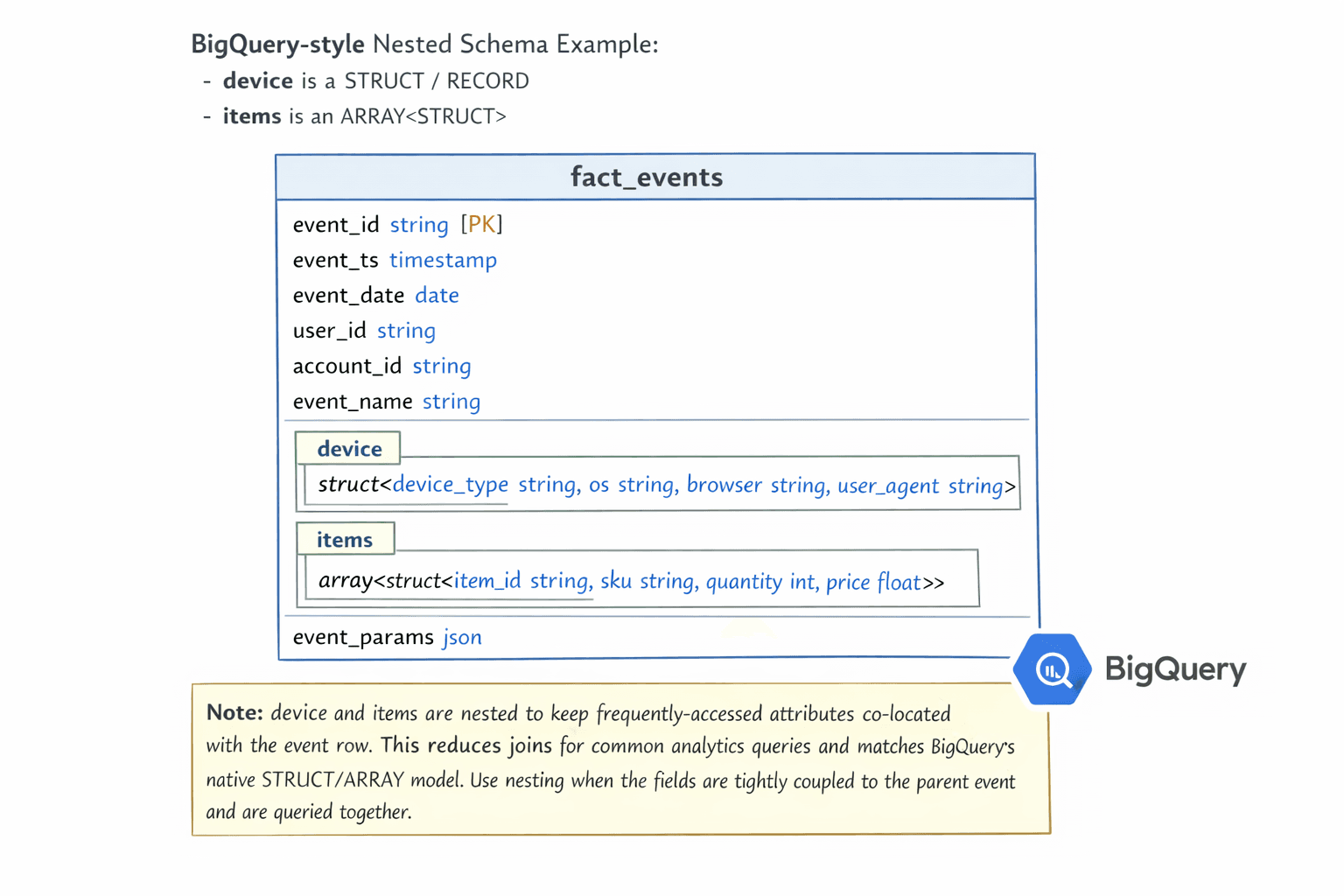 BigQuery supports nested and repeated fields. Used well, they reduce joins and can make query patterns simpler.