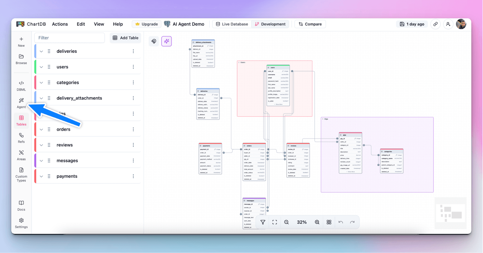 Upload your SQL script or connect to your database to load tables into ChartDB.Click “AI Agent”