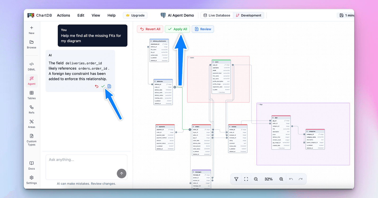 Foreign keys are the glue that holds your schema together - but in legacy or fast-growing systems, they’re often missing, hidden, or misused. With ChartDB’s AI Agent, you can now scan your schema, spot hidden relationships, and suggest foreign keys with confidence scores. No more detective work.